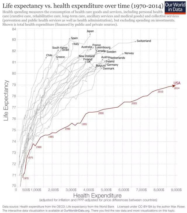 1970-2014年,Y軸是全球預期壽命,X軸是每年健康開(kāi)支壽命預期突破100歲,醫療開(kāi)支超過(guò)1萬(wàn)美元指日可待