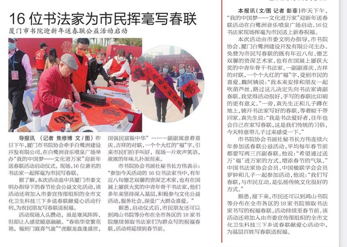 此次活動(dòng)是中共廈門(mén)市委文明辦指導下的社會(huì )公益文化活動(dòng),由廈門(mén)市書(shū)院協(xié)會(huì )與白鷺洲建設開(kāi)發(fā)公司聯(lián)合主辦,廈門(mén)中肯廣告公司策劃承辦。該活動(dòng)還將加入市委宣傳部組織的全市文化衛生科技三下鄉送春聯(lián)獻愛(ài)心活動(dòng)行列,為農民朋友寫(xiě)春聯(lián)送祝福。
